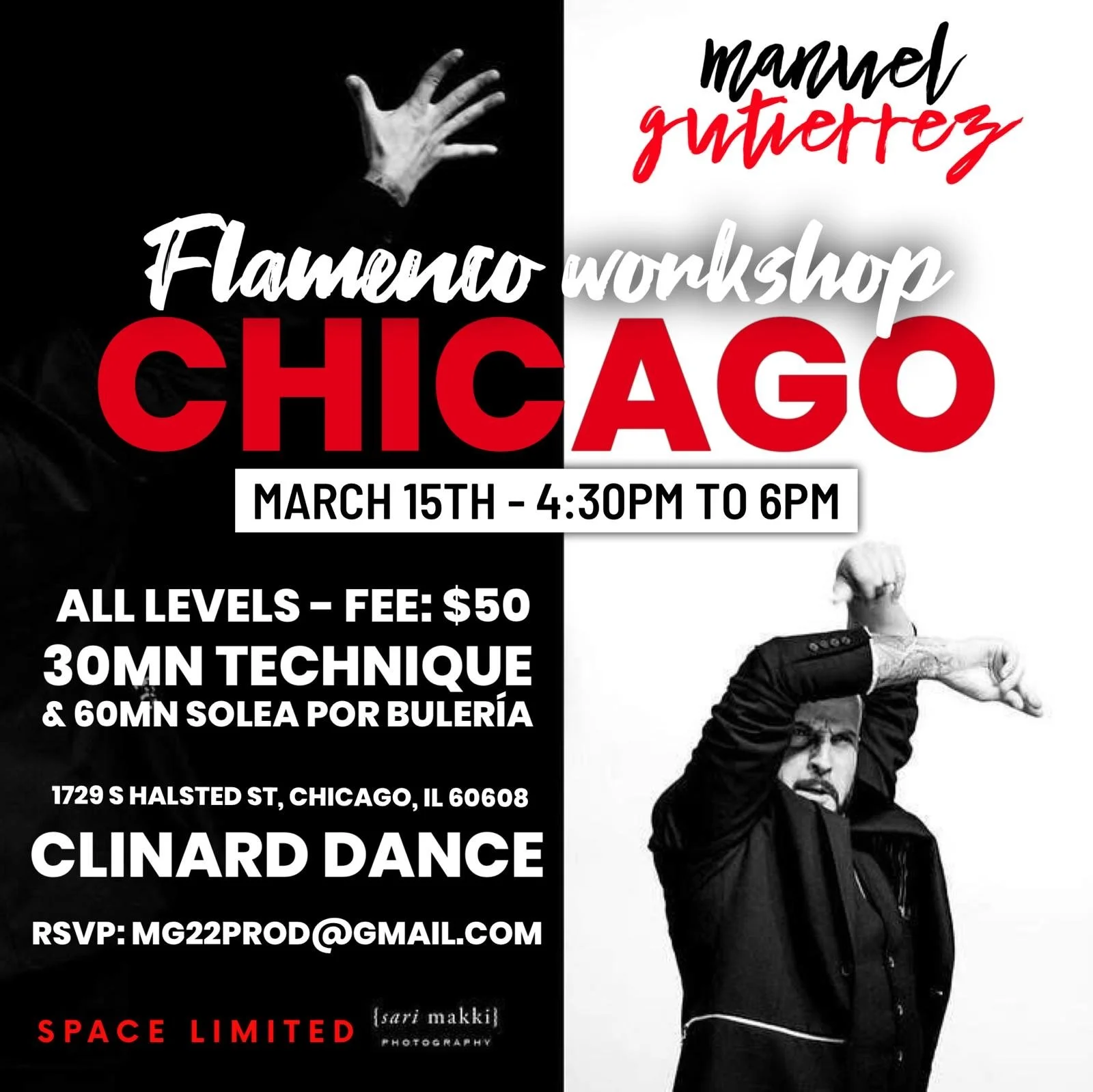 March 15th, 4:30-6pm Clinard Dance will be hosting Manuel Gutierrez for a flamenco workshop! For more information and to RSVP, email mg22prod@gmail.com